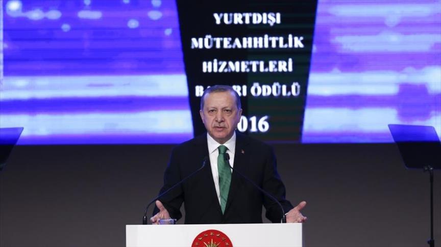 وجاءت تصريحات أردوغان هذه في كلمة ألقاها لدى حضوره حفل أقيم بالعاصمة أنقرة لتوزيع جوائر خدمات المقاولين الأتراك العاملين في الخارج.