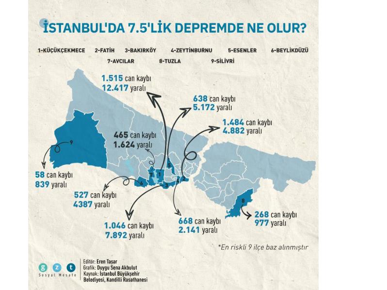 وحددت الدراسة المناطق التسع الأولى الأشد خطراً في حال حدوث الزلزال المتوقع بدرجة 7.5 بحسب الخبراء وفقاً للترتيب الآتي، بيوك شكمجي، الفاتح، باكركوي، زيتون بورنو، أسنلر، بيليك دوزو، أفجلار، توزلا، سيلفري.